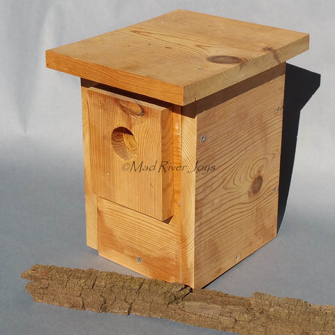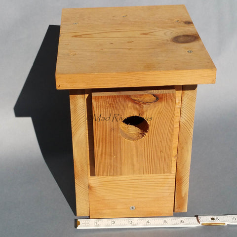 Eastern Bluebird Bird House Made Out of Pine Wood. Basic Design and Hole Size Welcomes Eastern Bluebirds, Wrens, Flycatchers, Swallows, Titmice, Chickadees, and Nuthatches.