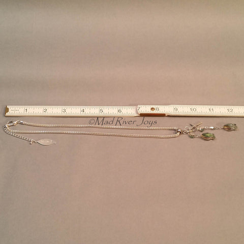 Rose Green Iris Crystal Fish, Round Green Faceted and Elongated Green Faceted Crystal Beads, and a Sterling Silver Cross Hang on an 18" Bright Silver Rope Mesh Necklace .