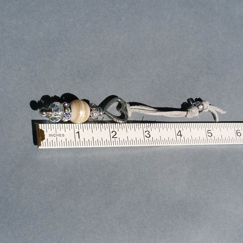 A Large White Lamp Worked Glass Bead with Silver Foil is Combined with Other Glass Crystal Rondelles in Clear Glass and Crystal AB. A Gray Suede Lanyard Makes It Easy to Grasp.