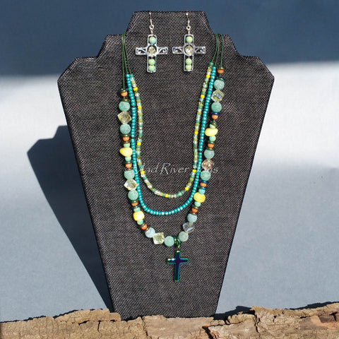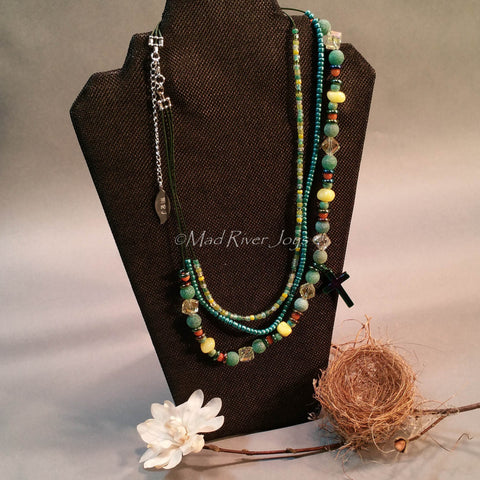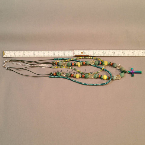 The Holy Trinity is Manifested for Easter in This Green Necklace Made of Trios. A Trio of Green Leather Cord Strands are Strung With Three Trios of Colorful Glass Beads Including Glass Crystal, Natural Stone, and Ceramic Raku. The Focal Point is a Wire-Wrapped Multi-Colored Hemalyke Cross.