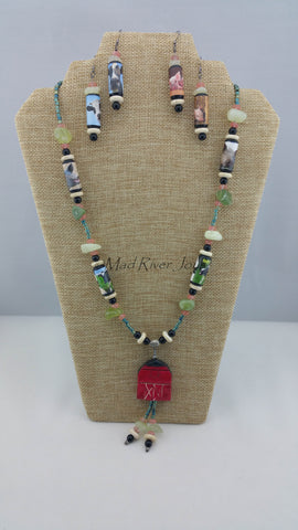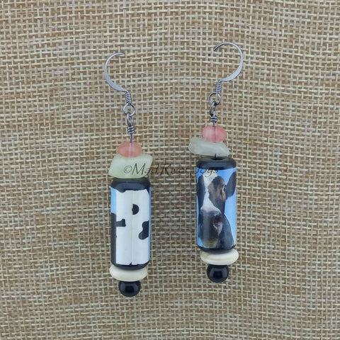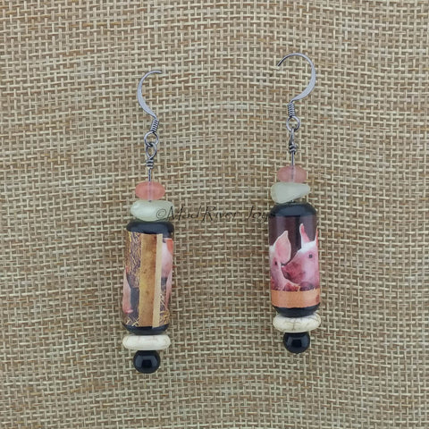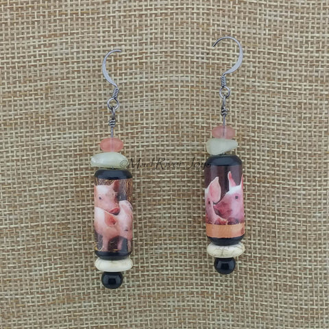 Welcome to the Farmyard! These Earrings Incorporate Farmyard Animal Paper Beads Handmade by Tonya Jeffcoat, Cherry Quartz Rondelles, Seagreen New Jade Chips, Ivory-Colored Discs, Black Glass Rounds, and Are Finished with Gunmetal Earwires.