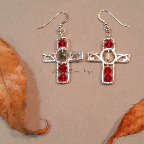 Red Crystal Bicones Symbolizing Jesus' Blood and Green Faceted Crystals Symbolizing Loaves of Bread Hang in a Silver Cross Bead Frame.