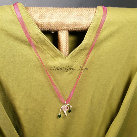 Pink Glass Heart with Green Metal Leaves on Adjustable Length Rose Organza Ribbon Necklace.